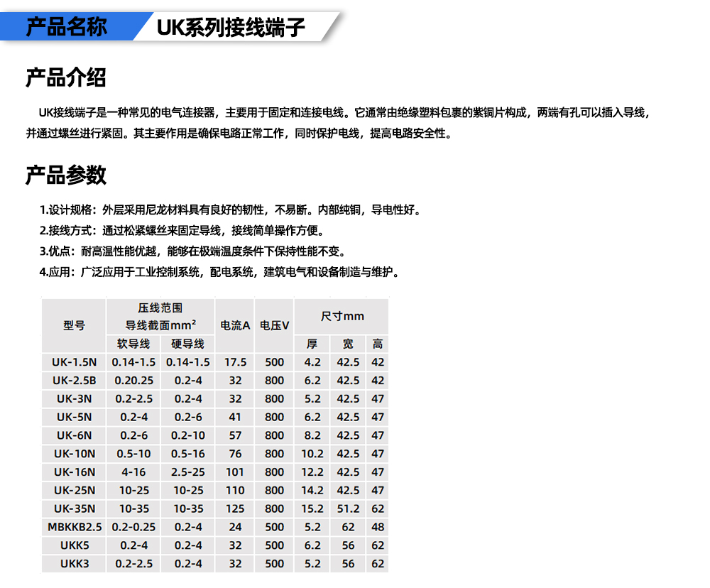 UK 系列接线端子是工业控制、配电设备、自动化系统中的核心接线元件,主打螺钉压接式可靠连接,可高效实现导线间、导线与设备端子的对接,适配电气布线场景需求。产品适配 0.2-16mm² 多规格导线(含单股、多股硬线及加塑软线),螺钉压接设计确保接触稳固不发热;耐温 - 40℃至 120℃,部分带防护盖防尘防触电;支持 35mm 标准 DIN 导轨安装,模块化可拼接且预留标识位,方便安装管理与后期检修,为电气系统安全运行提供基础连接保障。